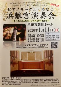 この生徒さんの参加されているピアノサークルの演奏会が1/11(日)浜離宮朝日ホールにて行われるそうなので、良ければ是非聴きにいらしてくださいね♪